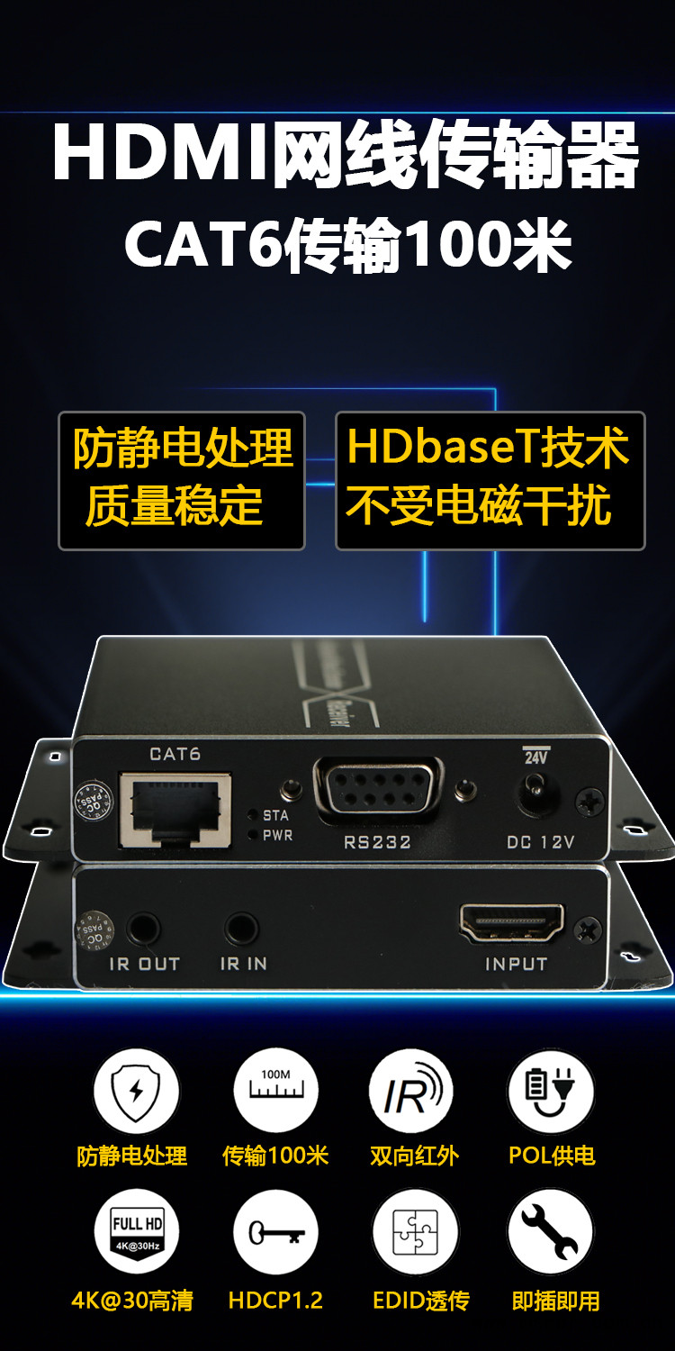 最大的傳輸距離:1080p@60--6類網線120米 ;1080p3D--6類網線100米;4K*2K --6類網線70米