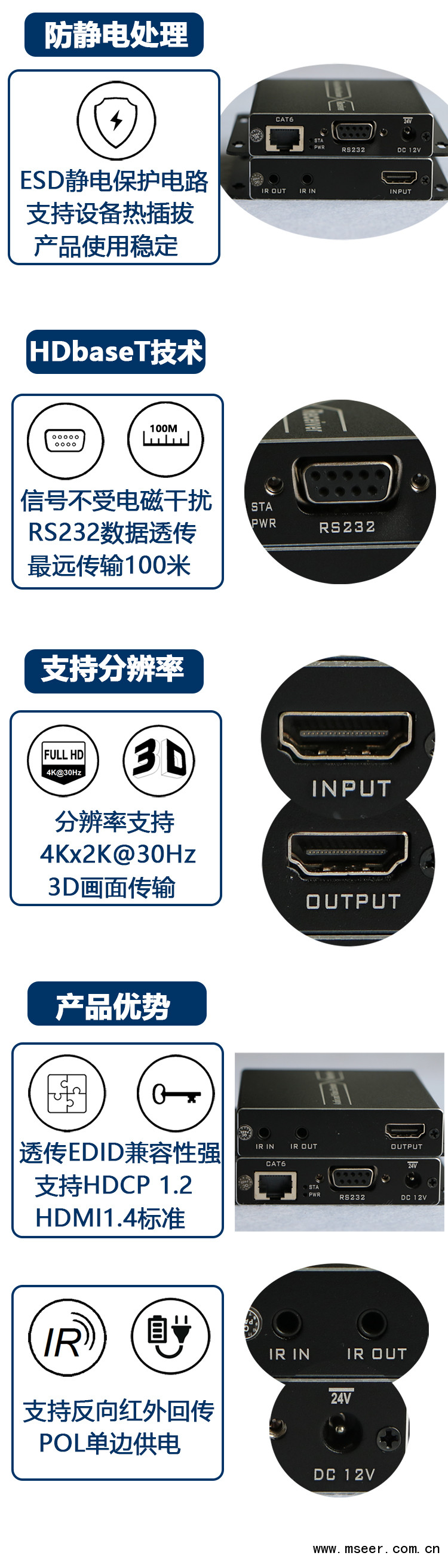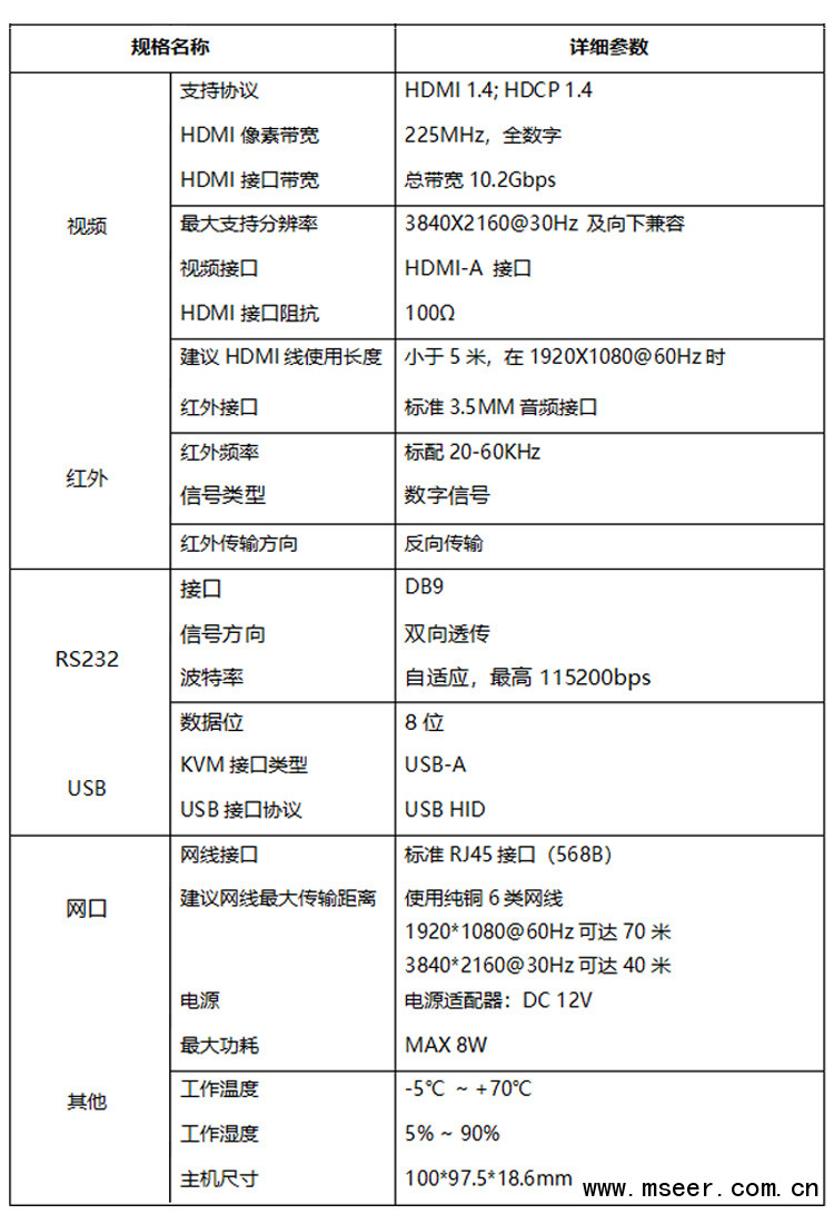 MBRH-T/R 是一對采用HD-baseT格式設計,只需單根6類網線就能將1080p@60信號延長至70/100米,同時支持3D信號以及4K@30信號。該設備能將HDMI信號延長的同時,還支持紅外線遙控信號的轉發延長以及RS232信號的延長,是一款非常適合大屏幕拼接、會議系統以及家庭娛樂。該設備抗干擾能力極強,保證信號的穩定。在實際工程中,采用不同規格的線纜,會對傳輸距離有影響,為了保證信號質量,請選用優質線纜和規范布線。